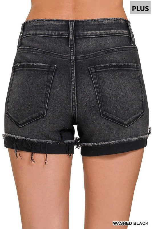 ZENANA Plus Washed Black Cuffed Raw Hem Denim Shorts